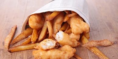 Fish & Chips, an invention credited to an Ashkenazi immigrant in London in 1860, is a popular take-away dish in South Africa, often served in a paper cone with chips (fries) and doused in malt vinegar.