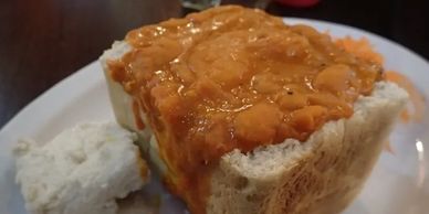 Bunny Chow, a quarter loaf of bread hollowed out and stuffed with curry, stew or other fillings, originated in Durban, South Africa. It's meant to be eaten on the go, without the aid of dishes and cutlery.